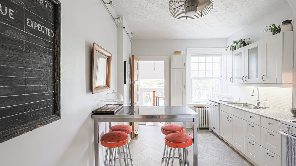 The large eat-in kitchen features a beautiful blend of vintage and contemporary elements and exits to a playful backyard. The backyard is a versatile space with outdoor seating, a BBQ, a small raised kale and herb garden, as well as a place for fitness and games.